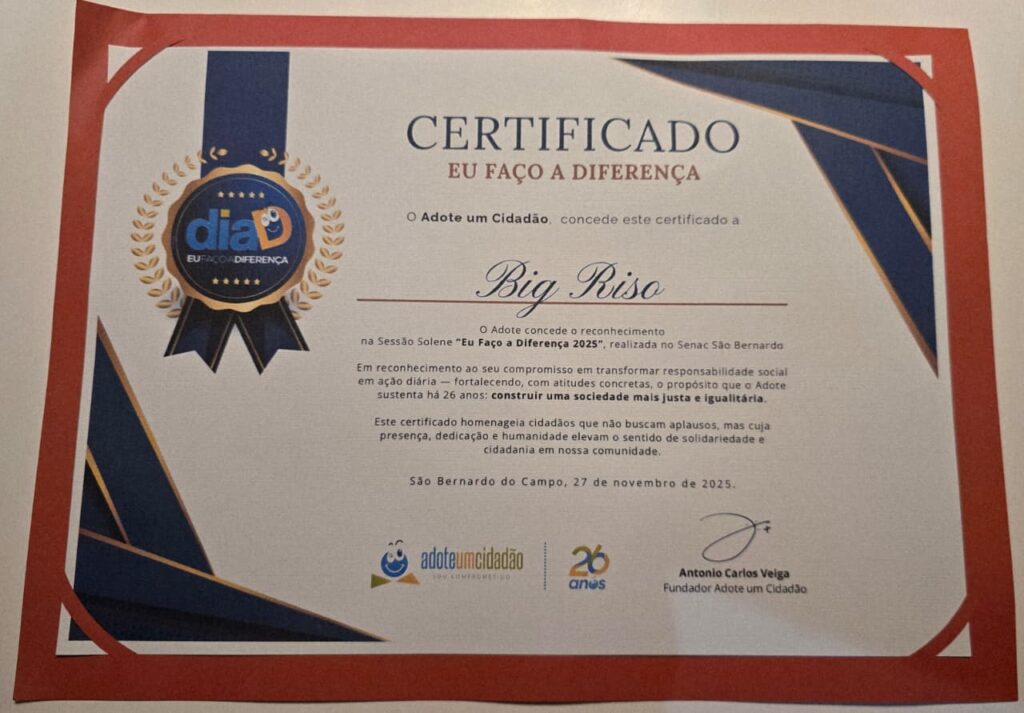 O grupo Big Riso, formado por voluntários que levam amor e risoterapia a pacientes em tratamento do câncer em hospitais e ambulatórios públicos, foi homenageado no dia 27 de novembro de 2025 com o título “Eu Faço a Diferença”, concedido pela ONG Adote um Cidadão.