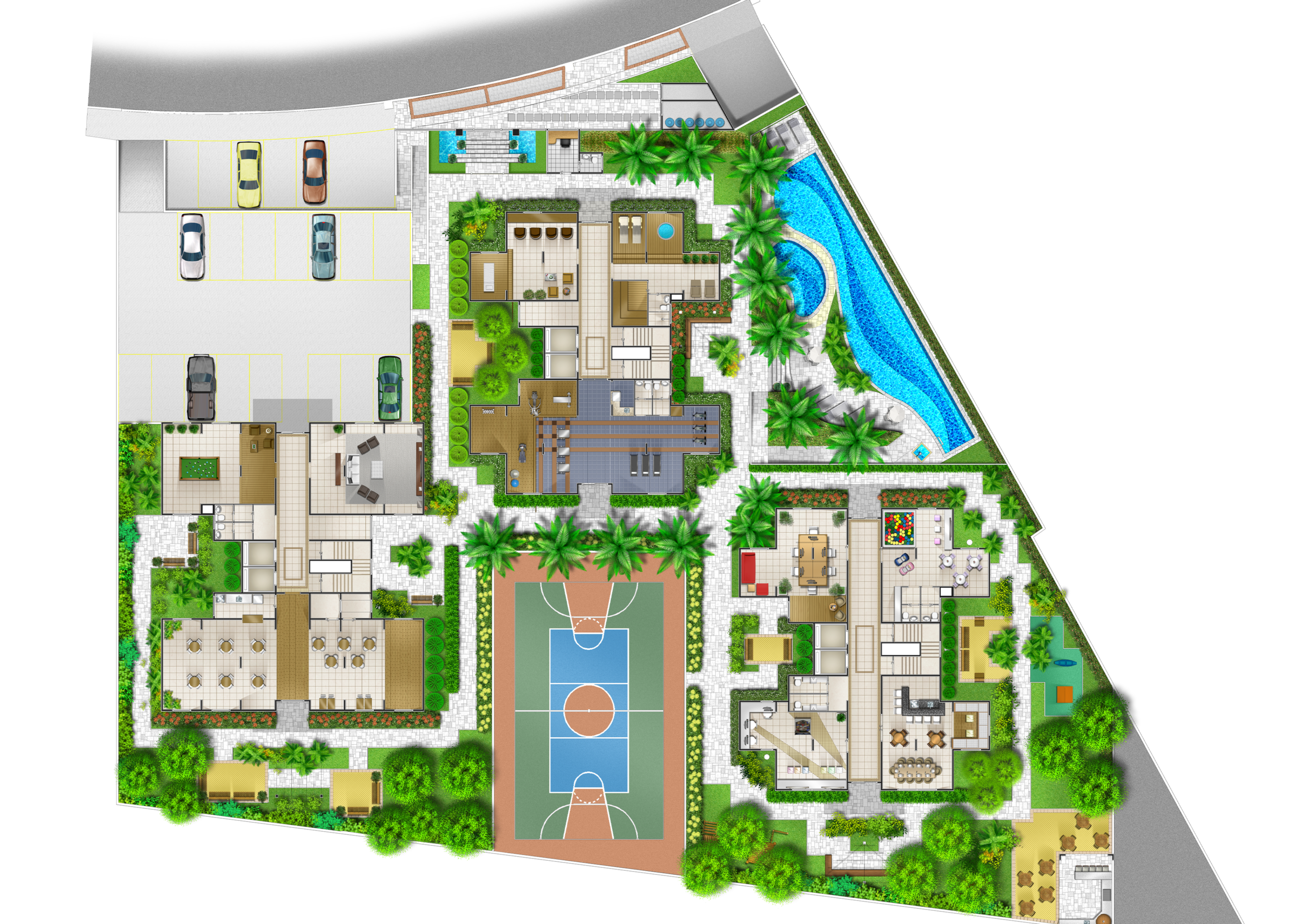Salão de jogos, quadra de esportes e salão de festas.